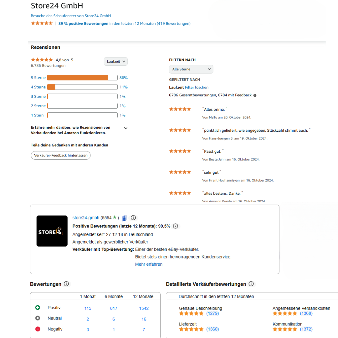 Als erfahrene Händler auf Amazon ( über 6.500 Bewertungen, 97 % positiv) und eBay ( über 5.500 Bewertungen, 99,5 % positiv) legen wir seit Jahren größten Wert auf Qualität und Kundenzufriedenheit. Mit unserer Expertise und dem Vertrauen tausender zufriedener Kunden bieten wir Ihnen erstklassige Produkte und einen herausragenden Service.