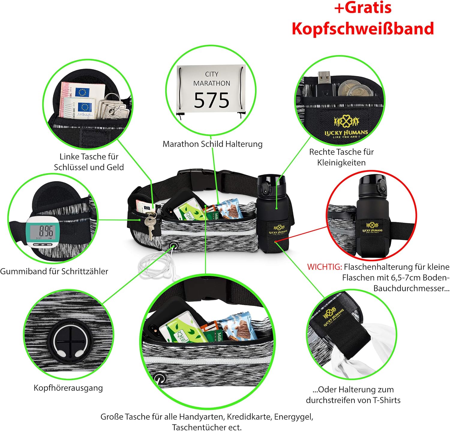 Lucky Humans Laufgürtel – Bauchtasche mit Flaschenhalter & Handyfach für Joggen, Laufen & Reisen